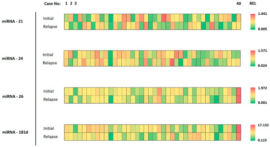 The expression of miRNAs in corresponding initial and relapse tumor specimens varied considerably. Individual cases presented with nearly the same miRNA expression level while others showed considerable heterogeneity between initial and relapse tumors. This is highlighted in Figure 2, where different colors represent the differing expression levels (REL).
