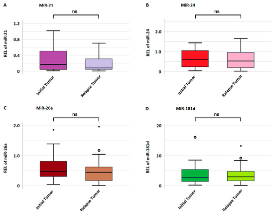 The mean miRNA expression in initial and relapse tumors was 0.29 ± 0.33 and 0.23 ± 0.28 for miRNA-21; 0.69 ± 0.61 and 0.62 ± 1.17 for miRNA-24; 0.65 ± 1.06 and 0.43 ± 0.56 for miRNA-26a; and 4.51 ± 4.43 and 3.21 ± 4.62 for miRNA-181d, respectively. There was no significant difference in miRNA expression between the initial and relapse tumors for any miRNA as highlighted in Figure 3. A gain in miRNA expression was considered if the relapse tumor harbored a value higher than the initial tumor and vice versa for a loss in expression. Regarding miRNA-21, 19 (47.5%) cases showed a gain and 21 (52.5%) a loss in expression. In regard to miRNA-24, 18 (45%) cases showed a gain, and 22 (55%) showed a loss in expression. Regarding miRNA-26a, 15 (37.5%) cases showed an increase, and 25 (62.5%) a decrease in expression. Lastly, regarding miRNA-181d, 15 (37.5%) cases showed a gain and 25 (62.5%) a loss in expression.