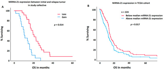 A comparison between the study collective (A) and the TCGA control group (B) regarding miRNA-21 expression and survival. Patients with a decrease in the miRNA-21 expression in their relapse tumor (red curve) showed a significantly longer survival in both cohorts.