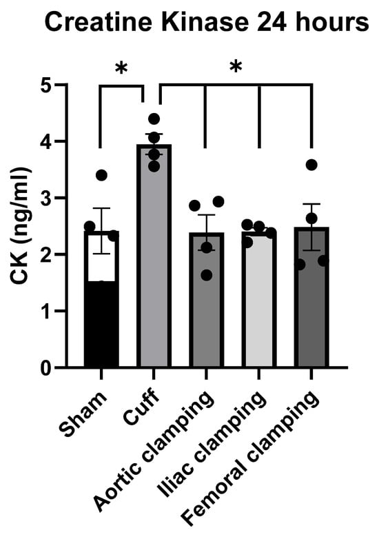 Creatine kinase (CK) concentrations. Plasma samples were collected from rats with L-IRI induced by the cuff or clamping of the aortic, iliac, or femoral artery (n = 4 rats for each group) 24 h after surgery and compared with the sham group. Statistical analysis was performed with one-way ANOVA; * p < 0.05 was considered significant.