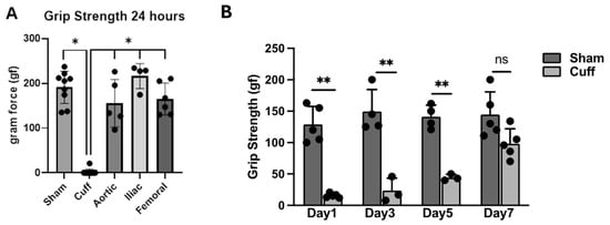 Measurement of grip strength of rats from different experimental groups. The grip strength of the left hindlimbs of the rats was measured with a grip strength meter (Ugo Basile 47,200 Grip Strength Meter) 24 h (A) for all groups and up to 7 days (B) after surgery for the cuff group. The ischemia-reperfusion injury of left hindlimbs was induced with cuff (n = 4) or clamping of the aortic (n = 5), iliac (n = 5), or femoral (n = 4) artery and compared with the sham group (n = 9). One-way ANOVA and two-way ANOVA followed by Sidak multiple comparison was performed to compare the grip strengths among different groups at 24 h after IRI and between the sham and cuff groups for up to 7 days, respectively (* p < 0.05, ** p < 0.01, ns, not significant).
