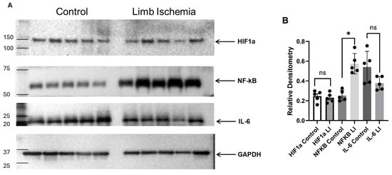 (A) Western blot analysis of the expression of inflammatory factors in the hindlimb tissue homogenates from SD rats after 3 h of limb ischemia compared with sham controls. The limb ischemia samples (n = 5) exhibited significantly higher NF-κB expression than the sham control group. The GraphPad Prism 10 software was used as a statistical analytical tool with an unpaired t-test. (B) Densitometry data: The relative expression of a target protein was calculated using the ChemiDoc MP Imager and Image Lab V 6.1 software. GAPDH was used as a loading control (* p < 0.05; ns, not significant).