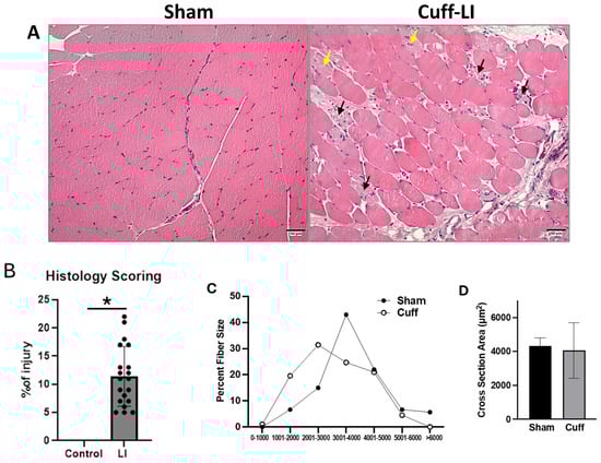 To evaluate histological muscle injury, the gastrocnemius skeletal muscle tissues from the left (ischemia) and right (control) hindlimb was isolated, fixed, and stained with hematoxylin and eosin. Following IR for 24 h, the control hindlimb tissue had conserved muscle integrity and normal peripheral myofiber nuclei while the cuff-LI hindlimb muscles exhibited noticeable morphological alterations, including pale myofibers with centralized nuclei (yellow arrows), necrotic tissue (black arrows), expended interstitial space, and inflammatory infiltrate (blue dots) (Figure 5A,B). Measurement of the individual muscle fiber area revealed highly disorganized myofibrils of varying diameters with rounded outlines in the cuff-LI group, while the sham group showed a more uniform fiber size compared to the cuff-LI group, despite there being no significant differences in average fiber size (Figure 5C,D).