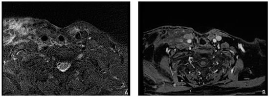 Example of a recurrence in the laterocervical right side with involvement of the thorax inlet in a patient with a larynx carcinoma treated with total laryngectomy with laterocervical dissection. (A) T2-weighted image. (B) Contrast enhancement shows that recurrence tissue is not dissociated from brachiocephalic vessels and sternocleidomastoideo muscle.