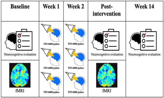 Transcranial pulse stimulation (TPS) intervention, functional magnetic resonance imaging (fMRI), and neurocognitive evaluation over 14 weeks. Each subject received three TPS sessions per week over two weeks.