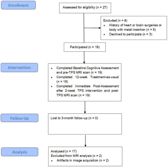 Sociodemographic characteristics of the participants are shown in Table 1. A total of 10 females and 7 males completed both pre- and post-MRI scan after TPS interventions (Figure 2). Their mean age was 74.06 years old. Slightly more than half were married (52.9%). Only two participants (11.8%) obtained a bachelor’s degree. Around a quarter (23.5%) of participants had a family history of mental disorders. No demographic characteristics were identified as significant covariates in association with the HK-MoCA scores. Participants were not restricted from food or water intake relative to the procedure, and no pain or discomfort was reported throughout the procedure.