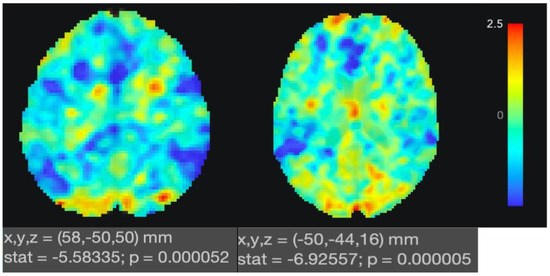 The fMRI investigations (n = 17) confirmed a specific down-regulation after TPS of the key structures within the brain’s limbic system that are involved in memory processing and emotional regulation. Paired t-tests between baseline and post-TPS functional connectivity (FC) with second-level seed-based analyses were conducted to assess changes pre- and post-TPS of FC for ROI of the left hippocampus and posterior right parahippocampus. The fMRI FC finding of the left hippocampus involved 85 voxels covering the left posterior division of the supramarginal gyrus (t-value: −5.58, size p-FDR: 0.030, size p-unc: 0.001393, size put: 0.001393) (Table 2 and Figure 3, left panel). For the ROI of the posterior right parahippocampus, a significant change in functional connectivity was observed, involving 86 voxels covering the atlas of the right posterior division of the supramarginal gyrus (t-value: −7.97, size PWE: 0.036482, size p-FDR: 0.029918, size p-unc: 0.000008) (Table 2 and Figure 3, right panel). The cluster’s significance is supported by FWE and FDR corrected p-values, indicating that the finding is unlikely to be a false positive, due to multiple comparisons.