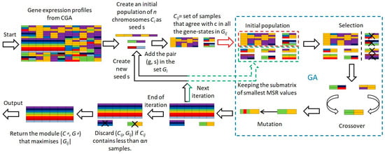 | 1. for i = 1 to ns do 2. GA begin 3. Create an initial population of n chromosomes Ci (i = 1, 2, …, n) as seeds 4. Set iteration counter t = 0 5. Choose a subset Di of the samples with size sd 6. For every gene g in Di, include the pair (g, s) in the set Gij if g is in the state s in c and all Di samples 7. Cij = set of samples that agree with c in all the gene-states in Gij 8. Calculate the MSR fitness value for each chromosome 9. while (t < MAX) 10. Select a pair of chromosomes form initial population based on MSR fitness 11. Apply crossover operation on selected pair with crossover probability 12. Apply mutation on the offspring with mutation probability 13. Replace old population with newly generated population 14. Increment the current iteration t by 1. 15. end while 16. Discard (Cij, Gij) if Cij contains less than αn samples. 17. returen the best solution, Ci with min MSR 18. GA end 19. return the module (C*, G*) that maximises |Gij|, 1 ≤ i ≤ ns |