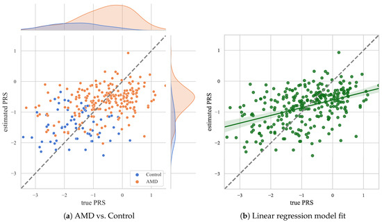 Figure 3. Scatter plots for the results of all folds test sets comparing true and estimated PRS values and the distributions in the control and AMD groups (a) and a linear regression model fit (b).