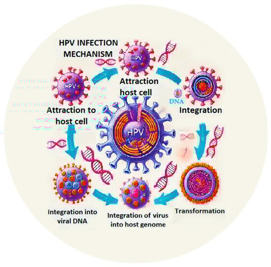 According to Humans I.W.G., HPV infects epithelial cells through skin or mucous membrane micro-abrasions []. The virus accesses the basal layer of the epidermis, where it replicates and induces cell proliferation, leading to the formation of warts (Table 2). In persistent infections, HPV DNA can be integrated into the host genome, leading to the malignant transformation of cells [].