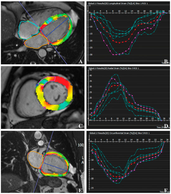CMR is a valuable tool for evaluating myocardial strain and aligns well with speckle-tracking echocardiography [9]. Feature-tracking CMR (FT-CMR) accurately measures 2D and 3D LV strains, including GLS, global radial (GRS), and global circumferential strain (GCS) [10,11]. GLS, GRS, and GCS from FT-CMR have reliably predicted post-myocardial infarction LV remodeling [9]. A meta-analysis showed that GLS predicts mortality in coronary artery disease and dilated cardiomyopathy patients [12], and it also forecasts cardiac mortality, heart transplantation, ventricular tachycardia, and major cardiovascular adverse events (MACEs) in myocarditis [13,14].