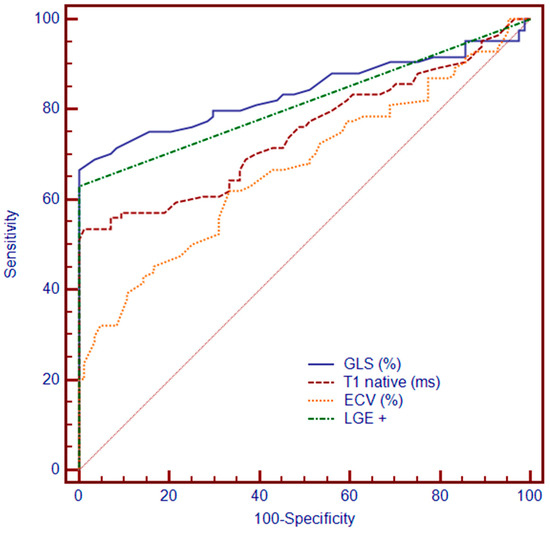 ROC analysis demonstrating the ability of GLS, T1 native, ECV, and LGE. Abbreviations: GLS, global longitudinal strain; LGE, late gadolinium enhancement; ECV, extracellular volume.