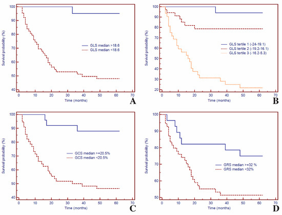Kaplan–Meier curves for time-to-event analysis of GLS (A,B), GCS (C), and GRS (D). Abbreviations: GLS, global longitudinal strain; GCS, global circumferential strain; GRS, global radial strain.