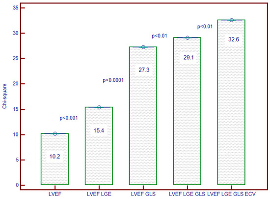 Initially, LVEF alone demonstrated predictive value (Chi-square = 10.24; p = 0.0014). The addition of LGE to LVEF improved prediction (Chi-square = 15.46; p = 0.0032). However, the inclusion of GLS with LVEF and LGE markedly enhanced predictive accuracy (Chi-square = 27.04; p < 0.0001), underscoring GLS’s critical role. Further, incorporating ECV alongside LVEF, LGE, and GLS led to the highest predictive performance (Chi-square = 32.66; p < 0.0001), reinforcing the central importance of GLS in risk stratification (Figure 5).
