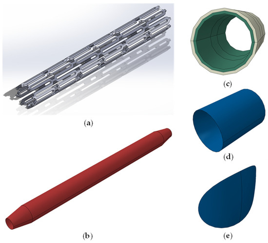 (a) SolidWorks stent model, (b) Abaqus balloon model, (c) Abaqus inner and outer artery layer models, (d) Abaqus quarter plaque model, (e) Abaqus cylindrical plaque model.