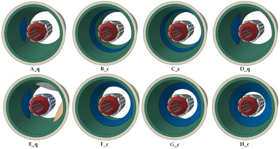 Using the previously mentioned parts, a total of eight models of increasing stenosis are created, shown in Figure 3. Aside from numbering the models using letters, a secondary letter is used to specify whether the model uses a cylindrical plaque or a quarter plaque. For example, model A_q is the first model with the smallest stenosis, and has a quarter plaque, while model B_c has the smallest stenosis among the cylindrical plaque models. In all models, the plaques are placed in the middle of the artery. This does not apply to model E_q, where the larger quarter plaque is placed in the middle of the artery, and the two smaller plaques are placed at a 157° and 255° angle relative to the quarter plaque and at a +0.65 mm and −0.30 mm distance from the middle of the artery.