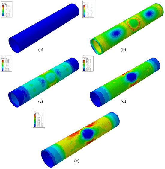 Simulation phases of an artery with cylindrical plaque. (a) Beginning of simulation; (b) stent and plaque first contact; (c) stent and artery direct contact; (d) damage initiation of artery; (e) damage propagation and end of simulation. Each phase has its own color map.