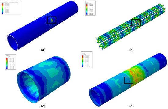 Detection of failures in a model with cylindrical plaque using stress plots. (a) Interlaminar failure; (b) stent mechanical failure; (c) plaque mechanical failure; (d) artery mechanical failure. For each part, the ultimate tensile strength is displayed by the red color. The failure area of each part can be seen in the black boxes.