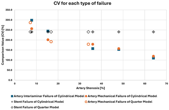 Concerning artery failures, an inverse relation is established between the pressure point of arterial failure (both mechanical and interlaminar) and the stenosis percentage. For models sharing the plaque type, an increase in stenosis was observed to lead to smaller CVs at the point of failure. Specifically, between the models with quarter plaque, concerning the comparisons of models A_q and D_q, as well as models D_q and E_q, the CV at the failure point decreases by 33.1% and 6.7%, respectively, as the stenosis increases by 132.2% and 102.5%, respectively. Additionally, for the cylindrical plaque models, between models B_c and C_c, models C_c and F_c, models F_c and G_c, and models G_c and H_c, for a 95.9%, 134.4%, 33%, and 33% increase in stenosis, respectively, the CV at the point of artery rupture shows a 21.6%, 21.9%, 2.7%, and 28.2% drop, respectively.