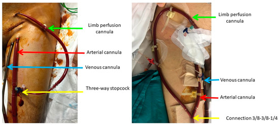 Surgical cannulation was performed in the Intensive Care Unit as per the center’s protocol, avoiding the need to transfer the unstable patient in CS to the operating room. In most patients, femoral access is used, with an arterial cannula introduced into the common femoral artery and a multi-perforated venous cannula into the femoral vein. For limb perfusion, a pediatric arterial cannula is used and connected to the ECMO arterial line. Some patients with a reduced femoral artery caliber require the placement of a Dacron graft, through which an arterial cannula is introduced, enabling simultaneous systemic and limb perfusion. In the past, the limb perfusion cannula was connected to the arterial cannula via a three-way stopcock, but now a 3/8-3/8-1/4 connection is used from the ECMO arterial line to arterial and limb perfusion cannulas to avoid the resistance that occurred with the three-way stopcock and to reduce thrombotic complications and limb ischemia. The cannulas are inserted into the femoral vessels after creating a purse-string suture with polypropylene, which is then secured with tourniquets tied to the arterial cannulas to prevent movement. In contrast, the venous cannula is not fixed to allow for repositioning if needed (Figure 2). Transthoracic echocardiography is used to confirm the correct positioning of the venous cannula entering the right atrium. Additionally, the cannulas are inserted through cutaneous counter incisions to allow for wound closure and prevent infection until ECMO weaning is possible. The procedure is performed with systemic heparinization using sodium heparin at a dose of 1 mg/kg. After 24–48 h, if no bleeding complications arise, the continuous infusion of sodium heparin is initiated.