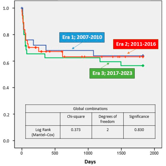Early mortality (day 30) did not significantly change over the years and was 19% from 2007 to 2010 and 14% from 2017 to 2023 (p = 0.822). No significant differences were found in mortality until hospital discharge (overall series: 25%), at one year (overall series: 36%), and five years (overall series: 39%). These results are shown in Table 2. Figure 3 shows survival over the study period for the three analyzed periods.