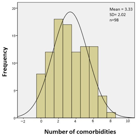 Overall prevalence of complications in patients pre-transplant (complications per patient). The histogram shows the percentage of patients presenting each number of complications.