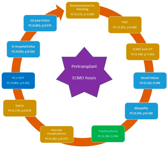 Association between complications and duration of pre-transplant ECMO support. Statistically significant associations are shown in green, trends in yellow, and associations without statistical significance in blue (Pearson correlation). Abbreviations: DVT: deep vein thrombosis; ECMO: extracorporeal membrane oxygenation; EP: pulmonary embolism; PC: Pearson correlation; PGD: primary graft dysfunction.