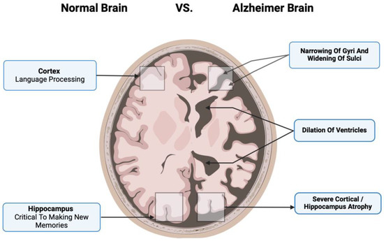 Additionally, human MSCs can lower Aβ42 levels by stimulating autophagy both in vitro and in vivo [39]. Figure 1 compares the neurons of a healthy cortex and those diseased by Alzheimer’s. Figure 2 depicts the main pathological markers in a diseased Alzheimer’s.