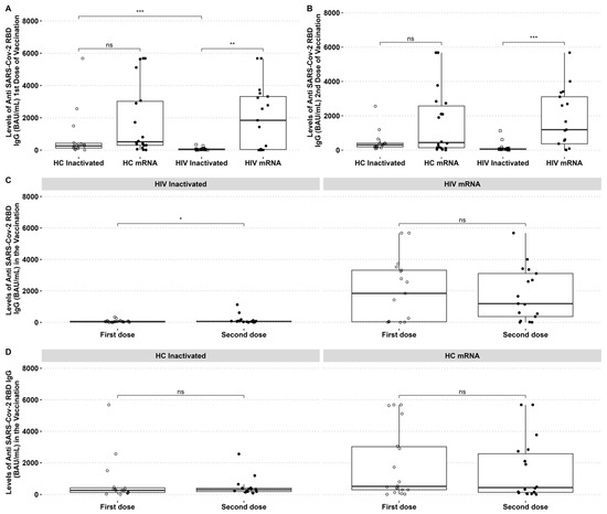 The SARS-CoV-2 reactive IgG was higher in HIV patients who received the mRNA vaccine than those who received the inactivated vaccine. The SARS-CoV-2 reactive antibody to RBD was higher in HCs than in PLHIV receiving the inactivated vaccine after the first dose. The mRNA vaccine group had higher anti-RBD IgG than the inactivated vaccine group in PLHIV and HCs (Figure 1A,B). However, it was observed that the levels of IgG anti-RBD in HIV patients who received the mRNA vaccine decreased after the second dose, with no significant difference between the two time points (Figure 1C). By contrast, PLHIV who received the inactivated vaccine had an increased IgG-specific RBD after the second dose (Figure 1C). There was no difference in HCs IgG-specific RBD after the first and second dose of inactivated and mRNA vaccines (Figure 1D).