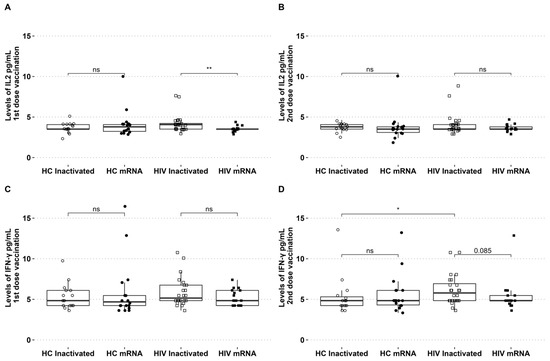 The levels of IL-2 and IFN-γ in circulation were assessed during the two vaccination periods. The levels of IL-2 showed an increase after the initial dose of the inactivated vaccine, with no discernible difference observed between the groups of healthy individuals who received either the inactivated or mRNA vaccines. For PLHIV who received the inactivated vaccine, the level of IL-2 was found to be higher compared to those who received the mRNA vaccine (Figure 2A). There were no significant differences in IFN-γ levels among the groups following the initial vaccination with inactivated and mRNA vaccines (Figure 2B). The levels of IL-2 and IFN-γ in the second dose of both vaccination platforms were similar across all groups (see Figure 2B,D). For PLHIV who received the inactivated vaccine, the levels of IFN-γ were slightly higher in the second dose compared to PLHIV who received the mRNA vaccine (p = 0.08). The levels of IFN-γ in people living with HIV who received the second dose of the inactivated vaccine were found to be higher compared to healthy individuals who also received the inactivated vaccine (Figure 2D).
