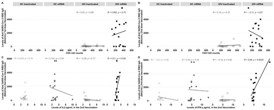 PLHIV demonstrated increased levels of IgG following the administration of a second dose of the inactivated vaccine and a first dose of the mRNA vaccine. The study examined the correlation between CD4 cell counts and IgG levels before and after vaccination. No notable correlation was observed between the inactivated and mRNA vaccination groups (Figure 3A,B). The levels of IgG showed a clear, direct correlation with the cytokines IL-2 (Figure 3C) and IFN-γ (Figure 3D), specifically in individuals with HIV who received the mRNA vaccine. On the other hand, there was a negative correlation observed between IgG-specific RBD and the IFN-γ found in HCs who received the mRNA vaccine (Figure 3C).