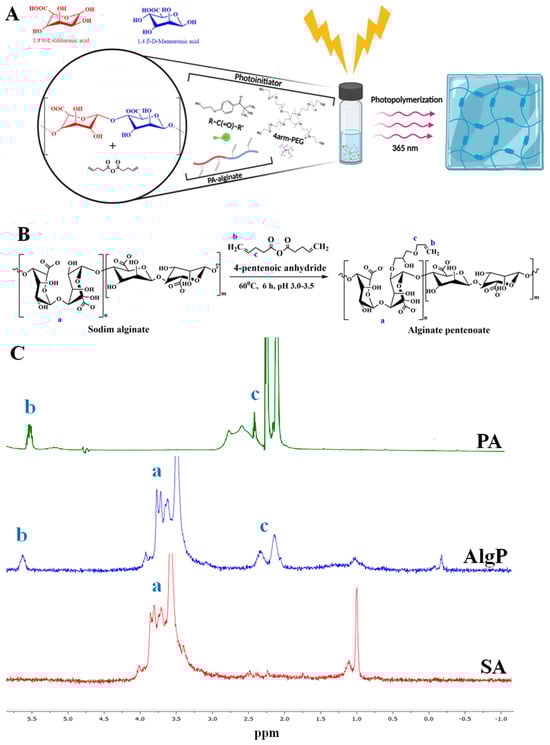 In this study, a sodium alginate solution (SA, 0.09 M) was prepared in 10 mL of Milli-Q water for the synthesis of modified sodium alginate. While continuously stirring, pentenoic anhydride (PA, 0.006 M) was added to the alginate solution. The reaction was carried out in an acidic medium (pH = 3) with the addition of concentrated acetic acid at 60 °C for six hours. A large amount of cold ethanol was added to precipitate the product. After the reaction, the product was precipitated using a large volume of cold ethanol, washed 2–3 times with ethanol, and then dried via lyophilization. The entire synthesis process was carried out in complete darkness. Modified alginate was synthesized by the reaction of sodium alginate with pentenoic anhydride (Figure 1A). After dialysis purification, the structure of the resulting alginate matrix was examined by 1H NMR spectroscopy (Figure 1B,C). The spectrum showed characteristic peaks confirming the successful introduction of 4-pentenoic groups into the alginate structure (AlgP). Two singlets were observed in the regions 2.5–2.3 ppm (c) and 2.3–2.1 ppm (c), corresponding to the protons of the OOCCH2CH2CH=CH2 group. The signals of the protons of the CH and CH2 groups of the glucose part of the alginate molecule appeared in the region of 3.2–3.9 ppm (a) as a complex multiplet, which is typical for this structure. The methylene protons of the vinyl fragment CH=CH2 gave a singlet in the region of 5.5–5.7 ppm (b), confirming the presence of vinyl groups in the modified product. Minor impurities were observed at −0.25 ppm and 1 ppm in the spectrum. These peaks likely correspond to trace residual solvents or unreacted small molecules, but they are present at very low intensities and do not affect the overall structure or integrity of the modified alginate product. Additionally, the characteristic peaks clearly show that the intended modifications were successfully made to the alginate. The integral curve of the spectrum corresponded to the total number of protons, indicating the correct ratio between the various groups in the structure of the modified alginate (Figure 1C).