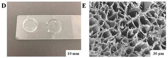 where and are the masses of the dry and swollen samples, respectively. The hydrogel was placed in sterile phosphate-buffered saline (PBS) (0.1 M, pH 7.4) at 37 °C for eight weeks, with the solution being replaced twice a week. After lyophilization (resulting in samples ), the degradation rate was calculated using the following formula: