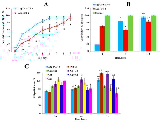 Evaluation of FGF-2 release and cytotoxicity of alginate hydrogels. (A) Profile of cumulative FGF-2 release from Alg-Ca-FGF-2 and Alg-FGF-2 hydrogels. (B) MTT assay for cytotoxicity of alginate hydrogels on rat ADMSC cells. (C) The effect of dressings with FGF-2, cefepime, and silver nanoparticles on the growth of dermal fibroblasts. Positive controls: FGF-2 (100 ng/mL), cefepime (10 mg/mL), and AgNPs (10 mg/mL) in culture medium. Values are presented as the mean value ± SD (n = 5). * p < 0.05, ** p < 0.01.