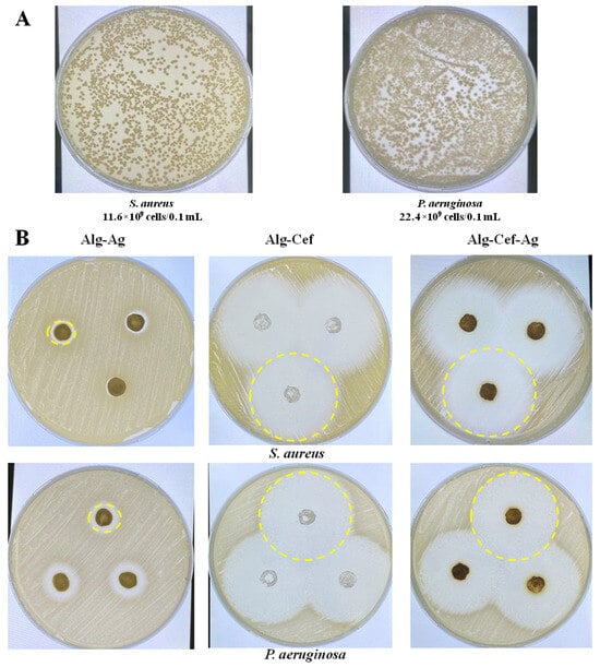 Antibacterial activity of alginate hydrogels. (A) Titer of cells from the overnight cultures of S. aureus and P. aeruginosa determined by visual counting of colonies after inoculation on LB culture medium. (B) Inhibition zones of test cultures of S. aureus and P. aeruginosa after incubation with hydrogel samples containing silver particles and cefepime at a concentration of 1%. The values are presented as the mean value ± SD (n = 5).