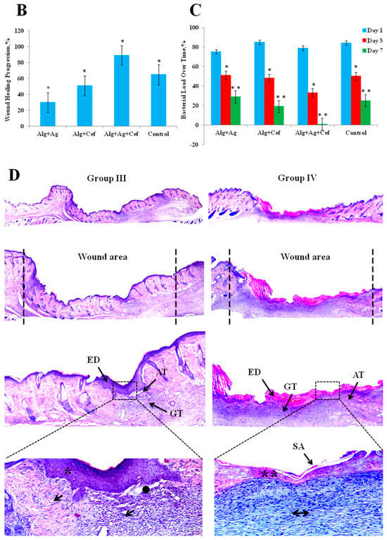 Regeneration of epidermal tissue in purulent wounds of rats using two–stage alginate dressing therapy. (A) Microscopic images of purulent wounds at 3, 7, and 14 days. (B) Wound healing rates in control and experimental groups. (C) Results of bacterial cultures taken from wounds on days 1, 3, and 7. * p < 0.05, ** p < 0.01. (D) Histological image of a wound area section: ED—epidermis; GT—granulation tissue; AT—adipose tissue; SA—skin appendage; robust, wellrevascularized GT (↓); poorly developed GT (↔); well—formed, dense ED (*); thin, fragile ED (**); regenerated AT (●).