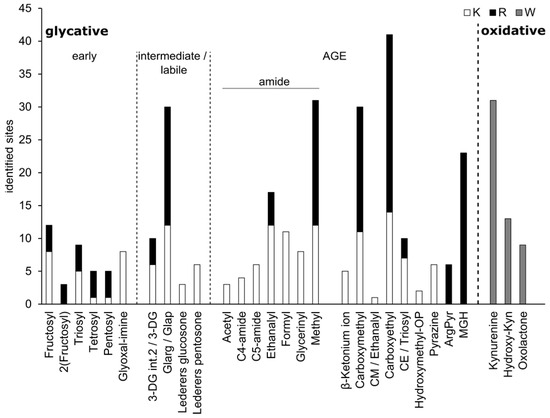 In total, 299 sites of glycative, AGE and oxidative modifications on 219 peptides could be identified based on the database search output of the MS2 analysis (Data S2). Lysine (K) and arginine (R) modifications were found with a similar frequency of 124 and 122 sites, respectively, and additionally, 53 sites of tryptophan side-chain oxidation were detected. Those modifications initiated by ROS included 31 kynurenine, 13 hydroxy-kynurenine and nine oxolactone modification sites.
