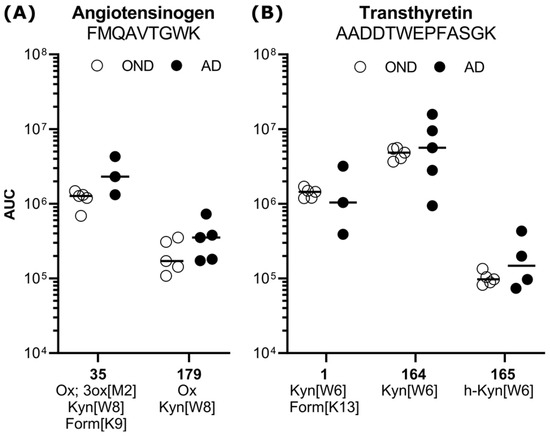 Exemplary quantification results of modification-specific forms of peptides in the OND control group (white circles) vs. AD, black circles with mean (dash). (A) Peptide FMQAVTGWK from angiotensinogen contains kynurenine (179) and a formyl modification (35). (B) Peptide AADDTWEPFASGK from transthyretin was identified and quantified with various oxidative tryptophan modifications and a glycoxidative formyl group. White circles represent the OND, black circles the AD group. Ox: oxidation, 3ox: trioxidation, Kyn: kynurenine, Form: formyl, h-Kyn: hydroxyl-kynurenine, AUC: area under the peak curve.