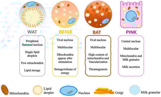 There are four distinct forms of adipose tissue (Figure 1), including white adipose tissue (WAT), brown adipose tissue (BAT), beige adipose tissue, and pink adipose tissue, which play a crucial role in maintaining homeostasis [10].