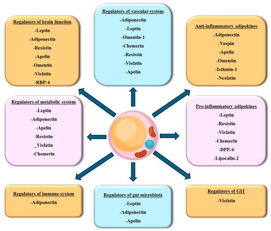 The importance of adipose tissue, an organ with endocrine, autocrine, and paracrine functions, has grown substantially. In addition to adipocytes, adipose tissue contains endothelial cells, fibroblasts, pericytes, preadipocytes, and various immune cell types. These non-adipocytic cell types, also known as the stromal vascular fraction, contribute to the adipose tissue secretory function [1]. Adipose tissue is regarded as a highly active endocrine tissue due to its secretory nature. Adipose tissue secretions impact the reactions of numerous tissues, such as the hypothalamus, endothelium, kidneys, skeletal muscle, pancreas, liver, and the immune system [2]. Adipose tissue releases hormones that have cytokine-like properties, known as adipokines [3]. One of the critical roles of these adipokines is the regulation of inflammatory processes in the body. Adipokines such as leptin, resistin, visfatin, and chemerin have pro-inflammatory effects, and on the other hand, adipokines such as adiponectin, vespin, apelin, omentin, and isthmin-1 have anti-inflammatory effects [4]. In addition to their role in inflammation, adipokines regulate food intake, body weight, insulin sensitivity, immune responses, and the reproductive axis to a significant degree [5]. Adipokines also affect the cardiovascular system and some aspects of the brain, especially those related to mood, cognition, reward system, and eating behavior [6]. Apparently, adipokines play a significant role in the communication between adipose tissues and other organs and tissues. Therefore, disturbance in their secretion can impact the function of different body organs [7].