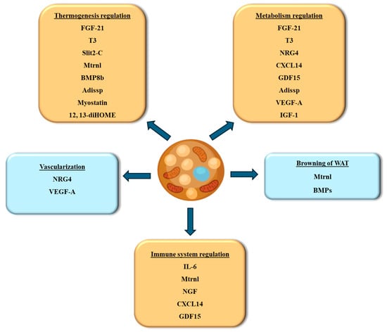 Batokines are signal molecules released by BAT. These molecules are critical in controlling metabolic processes, communicating with other tissues, and influencing overall energy balance. Batokines represent a vital aspect of metabolic regulation through their role in inter-organ communication and energy homeostasis. Their ability to enhance thermogenesis, improve insulin sensitivity, and influence lipid metabolism makes them promising targets for therapeutic interventions in obesity and metabolic disorders. Ongoing research into batokines will continue to uncover their full potential and pave the way for innovative treatments to improve metabolic health. The following section discusses the batokines identified to date and their role in preserving energy homeostasis (summarized in Figure 4).