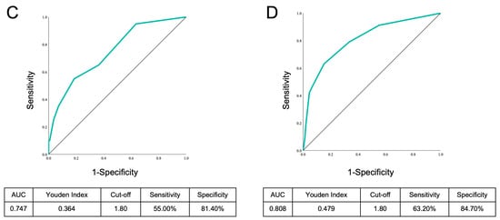 We established the ROC curves of the scale and calculated the corresponding AUC for all participants. The ROC curves revealed this rating scale had eligible discrimination (AUC = 0.788) to recognize PsA in psoriasis vulgaris patients. When the Youden index was 0.428, a sensitivity of 59.30% and a specificity of 83.50% with a cut-off value of 1.8 were observed. Patients with psoriasis vulgaris who achieved the threshold would be regarded as high risk for progressing to PsA according to this scale. The ROC curve is shown in Figure 1A. Moreover, to investigate the influence of different treatment statuses on the performance of this scale, we established the ROC curves and calculated the AUC for patients who received topical treatment, systemic treatment, and biological treatment respectively. The AUC was 0.746, 0.747, and 0.808 in the three treatment subgroups respectively. As for the cut-off value, we found that in the topical-treatment subgroup, the suitable cut-off value was 3.15 points, but in both the systemic- and biological-treatment subgroups, the suitable cut-off value was 1.80 points. These results are shown in Figure 1B–D.