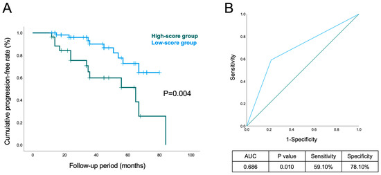 Moreover, the Kaplan–Meier curve and log-rank estimations showed that the high-score group had a significantly higher cumulative risk for suffering PsA than the low-score group (p = 0.001) (Figure 2A). The simple score, composed of CRP, IL-6 and TNF-α, with the cut-off value of 1.8, also showed satisfying predictive performance for PsA among the retrospective cohort of psoriasis vulgaris patients externally (AUC = 0.686, p = 0.010, sensitivity = 59.1%, specificity = 78.1%) (Figure 2B).