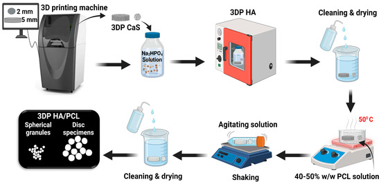 Figure 1). A graphical 3D image of the samples including spherical granules with 2.0 mm in diameter (for XRD, SEM, FTIR and compression load) and a disc with 5 mm in diameter and 1 mm thick (for TGA, contact angle, diametral tensile strength and cell proliferation) were designed and imported into the binder jetting three-dimensional printing machine (Projet160, 3D Systems, Rock Hill, SC, USA) to print the samples using calcium sulfate-based powder (Visijet PXL Core, 3D Systems, Rock Hill, SC, USA) and a liquid binder (Visijet PXL Clear, 3D Systems, Rock Hill, SC, USA). After printing, the fabricated calcium sulfate samples were immersed in 1M disodium hydrogen phosphate solution (Sigma Aldrich, St. Louis, MI, USA) at 100 °C in the air-circulated oven for 48 h to convert the as-printed calcium sulfate to hydroxyapatite by ion exchange reaction, as described in detail elsewhere [