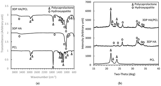 Three-dimensionally printed HA or 3DP HA/PCL was ground together with potassium bromide (KBr) and a KBR pellet was formed by a compression die. The samples were then examined using an FT-IR Spectrometer (Spectrum One, PerkinElmer, Shelton, CT, USA) at the wavenumber 4000–400 cm−1 with a resolution of 4 cm−1 using a TGS detector. The PCL sheet was examined by FT-IR Imaging Microscope (Spectrum Spotlight 300, PerkinElmer, USA) at the wavenumber 4000–600 cm−1 using the micro-attenuated total reflectance (Micro-ATR, PerkinElmer, Shelton, CT, USA) technique at the wavenumber 4000–600 cm−1 with a resolution of 4 cm−1 using an MCT detector.