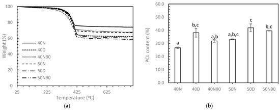 PCL content in the sample was determined by thermogravimetric analysis (TGA) using an STA analyzer (STA 449C, NETZSCH Instruments North America, LLC, Burlington, MA, USA) by heating the sample in an alumina crucible from 25 to 800 °C in an air atmosphere at a heating rate of 10 °C min−1. Infiltration content was determined as the weight loss percentage of PCL after pyrolysis in the TGA thermogram.
