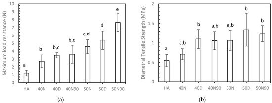 Figure 4 shows the mechanical properties of 3DP HA/PCL compared to those of 3DP HA alone. For compression load resistance, all 3DP HA/PCL samples demonstrated significantly higher values than the 3DP HA, with the extent of improvement varying based on the infiltration conditions. Specifically, the 50% PCL solution produced significantly higher compression load resistance compared to the 40% PCL solution for the same agitating solution. When comparing the same PCL solution concentration, a mixture of DI and NMP resulted in intermediate compression load resistance. Notably, significant differences in compression load resistance were observed between 50N or 50D and 50N90 when using the 50% PCL solution. For DTS test, only the 40D, 50D, and 50N90 samples showed significantly higher values than the 3DP HA. Although the 50% PCL solution tended to yield higher DTS than the 40% solution for the same agitating solution, no statistically significant differences were observed between the different PCL solution concentrations. Among the same PCL solution concentrations, NMP resulted in the lowest DTS, DI in the highest DTS, and a mixture of DI and NMP produced intermediate DTS. However, no significant differences in DTS were seen among the different agitating liquids. Overall, among all samples, 50N90 exhibited the greatest compression load resistance, while both 50D and 50N90 showed the highest DTS values.