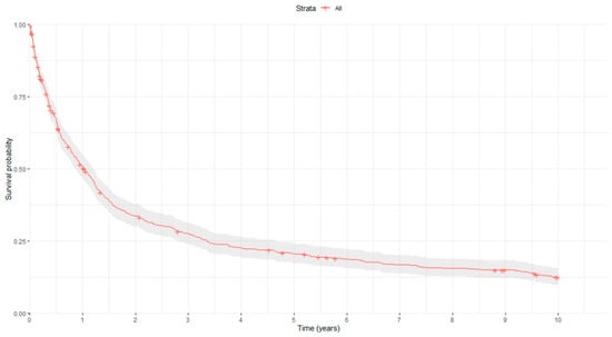 Kaplan–Meier survival curve. Red curve represents the estimated survival, while the gray area surrounding it indicates the confidence interval of the Kaplan-Meier estimator.