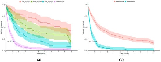 Overall survival curves: (a) TNM staging; (b) metastasis at diagnosis time.
