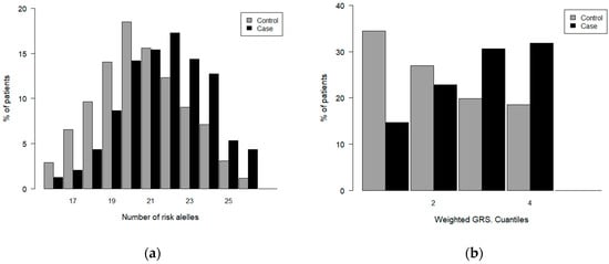 Figure 3 displays the distribution of the GRS values (unweighted and weighted) in GC patients and controls, constructed for the diagnostic model. Both populations follow a normal distribution with a maximum value of 20 risk alleles for the control group and 22 for the GC patient group, the value at which a shift occurs toward a higher percentage of high GRS values in patients compared to the controls (Figure 3a). A similar trend was observed for the distribution of weighted GRSs in patients and controls (Figure 3b).